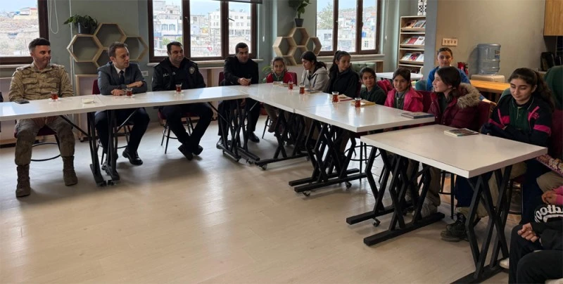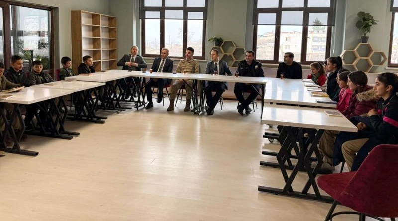 Ziyarette Kaymakam Karanfil’e; İlçe Jandarma Komutanı Veli Türk, İlçe Emniyet Amiri O. Barış Öztiryaki ve İlçe Milli Eğitim Müdürü Mehmet Kankılıç eşlik etti. Heyet, okulda düzenlenen “Kitap Söyleşisi” programı kapsamında öğretmenler ve öğrencilerle buluştu.