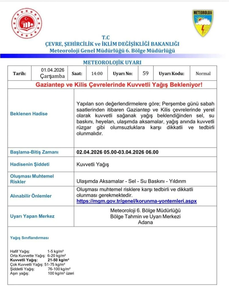Çevre, Şehircilik ve İklim Değişikliği Bakanlığı’na bağlı Meteoroloji Genel Müdürlüğü tarafından yayımlanan meteorolojik uyarıda, 2 Nisan 2026 saat 05.00 ile 3 Nisan 2026 saat 06.00 arasında bölgede yer yer kuvvetli sağanak yağışların etkili olacağı bildirildi.