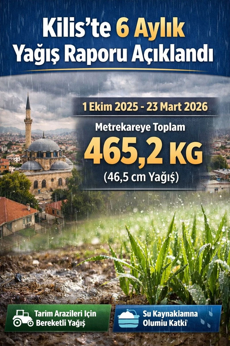 Açıklanan verilere göre Kilis merkezde 1 Ekim 2025 ile 23 Mart 2026 tarihleri arasında metrekareye toplam 465,2 kilogram (46,5 santimetre) yağış düştü.