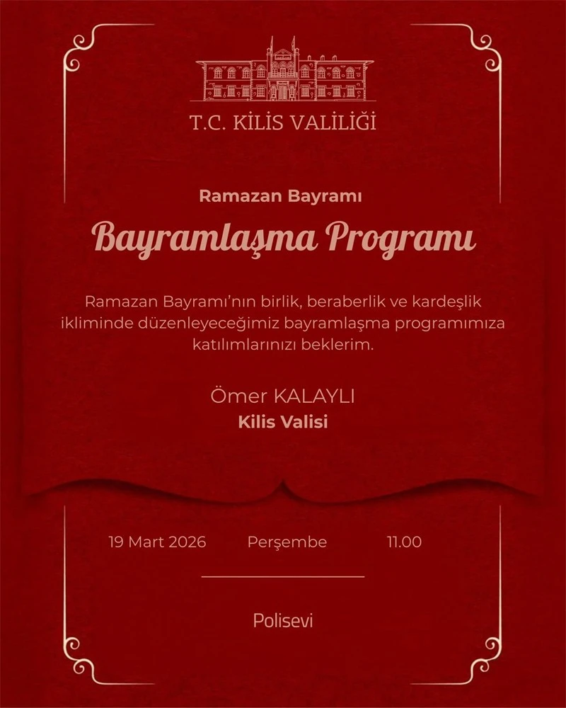 Edinilen bilgilere göre, bayramlaşma programı saat 11.00’de Kilis Polisevi’nde yapılacak. Programa Kilis Valiliği başta olmak üzere, kamu kurum ve kuruluşlarının temsilcileri, sivil toplum kuruluşları, siyasi parti temsilcileri ve çok sayıda vatandaşın katılması bekleniyor.