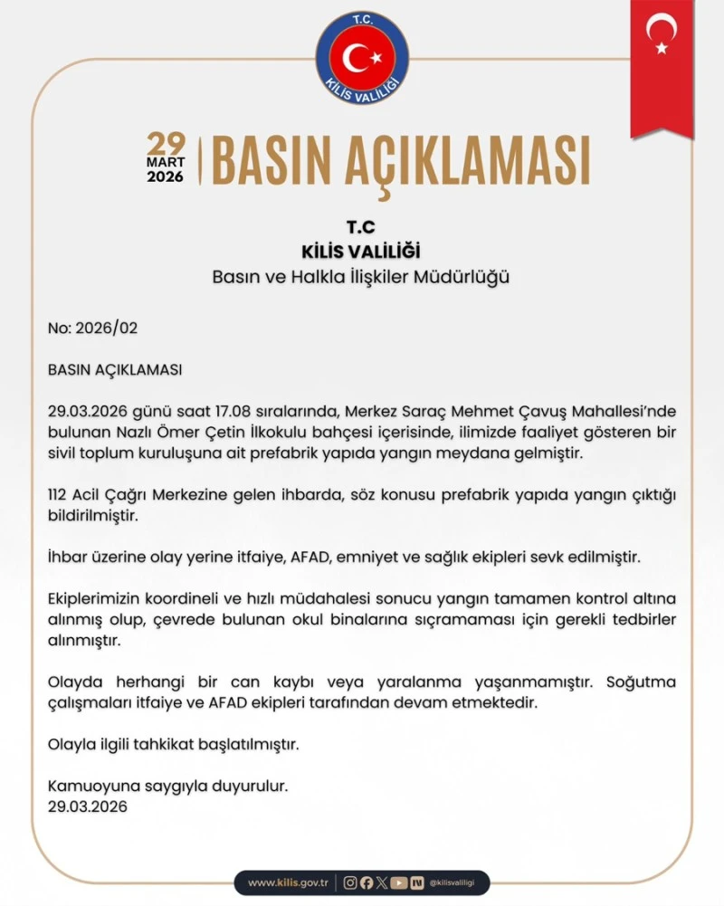 Kilis Valiliği’nden yapılan açıklamaya göre, 29 Mart 2026 günü saat 17.08 sıralarında Merkez Saraç Mehmet Çavuş Mahallesi’nde bulunan Nazlı Ömer Çetin İlkokulu bahçesi içerisinde yer alan prefabrik yapıda yangın meydana geldi. 112 Acil Çağrı Merkezi’ne yapılan ihbarda söz konusu yapıda yangın çıktığının bildirilmesi üzerine olay yerine çok sayıda ekip sevk edildi.