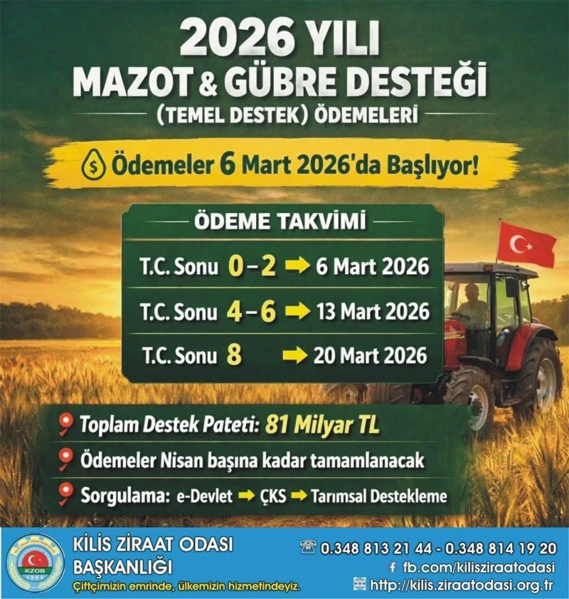 Açıklanan ödeme takvimine göre; T.C. kimlik numarasının sonu 0 ve 2 olan üreticilere ödemeler 6 Mart 2026, sonu 4 ve 6 olanlara 13 Mart 2026, sonu 8 olan üreticilere ise 20 Mart 2026 tarihinde yapılacak.