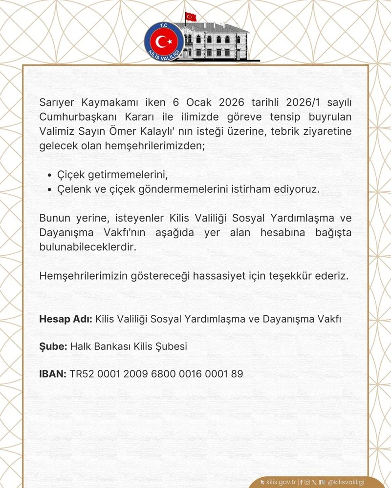 Vali Ömer Kalaylı, Kilis’teki görevine başlaması münasebetiyle kendisini ziyaret edecek olan vatandaşlardan çiçek, çelenk ve benzeri hediyeler getirmemelerini özellikle rica etti. Bu tür jestler yerine, arzu eden hayırsever vatandaşların Kilis Valiliği Sosyal Yardımlaşma ve Dayanışma Vakfı hesabına bağışta bulunmalarının kendilerini daha mutlu edeceğini ifade etti.