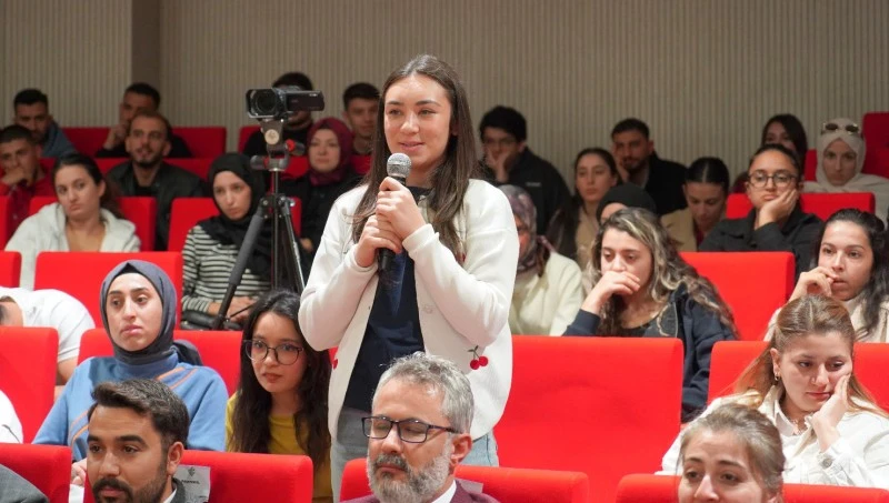 Öğrencilerin büyük bir katılım gösterdiği söyleşi, kamu yönetimine, liderlik anlayışına ve yöneticilik tecrübelerine dair zengin bir perspektif sunarak salonda canlı ve etkileşimli bir atmosfer oluşturdu.