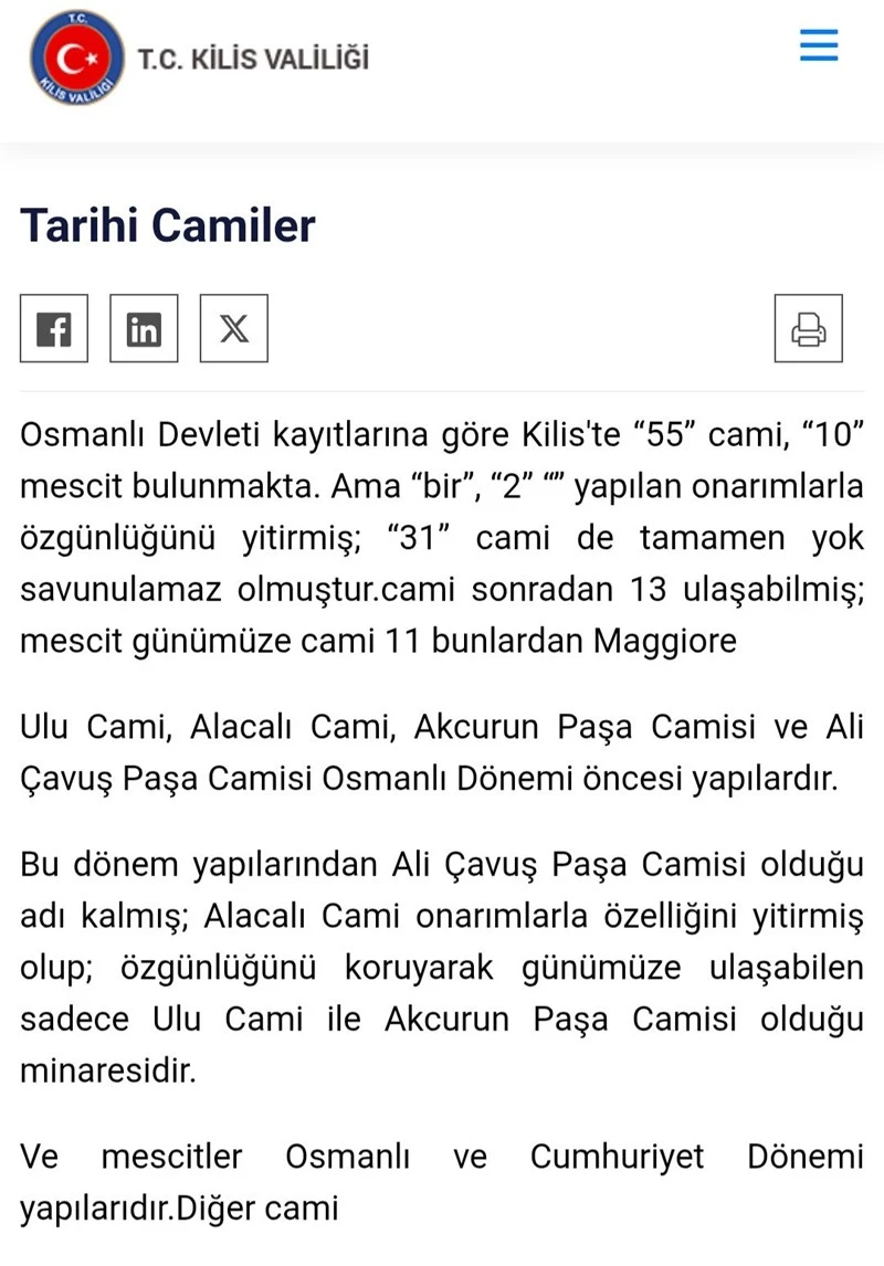 Bir kimse Kilis Valiliği'nin internet sayfasında Kilis'teki tarihi camilerle ilgili bilgi almak istese karşısına böyle yazım ve anlam hatalarıyla anlaşılmaz hâle gelmiş paragraflar çıkar.